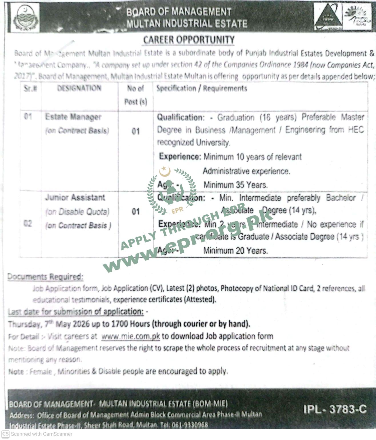 Board of Management, Multan Industrial Estate Jobs. Board of Management, Multan Industrial Estate (BOM-MIE) is a subordinate body of the Punjab Industrial Estates Development & Management Company (PIEDMC) . It is a company set up under Section 42 of the Companies Act, 2017. Located at Multan Industrial Estate Phase-II, Sheer Shah Road, Multan, BOM-MIE manages industrial estate operations. The board invites applications for Estate Manager and Junior Assistant positions on a contract basis. Female, Minorities, and Disabled persons are encouraged to apply. The deadline is May 7, 2026.