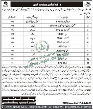 Responsibilities: Operate machinery for revenue record processing and office equipment maintenance. Requires Middle Pass + local domicile of District Pishin. Age: 18-28 years (relaxable to 43 years).