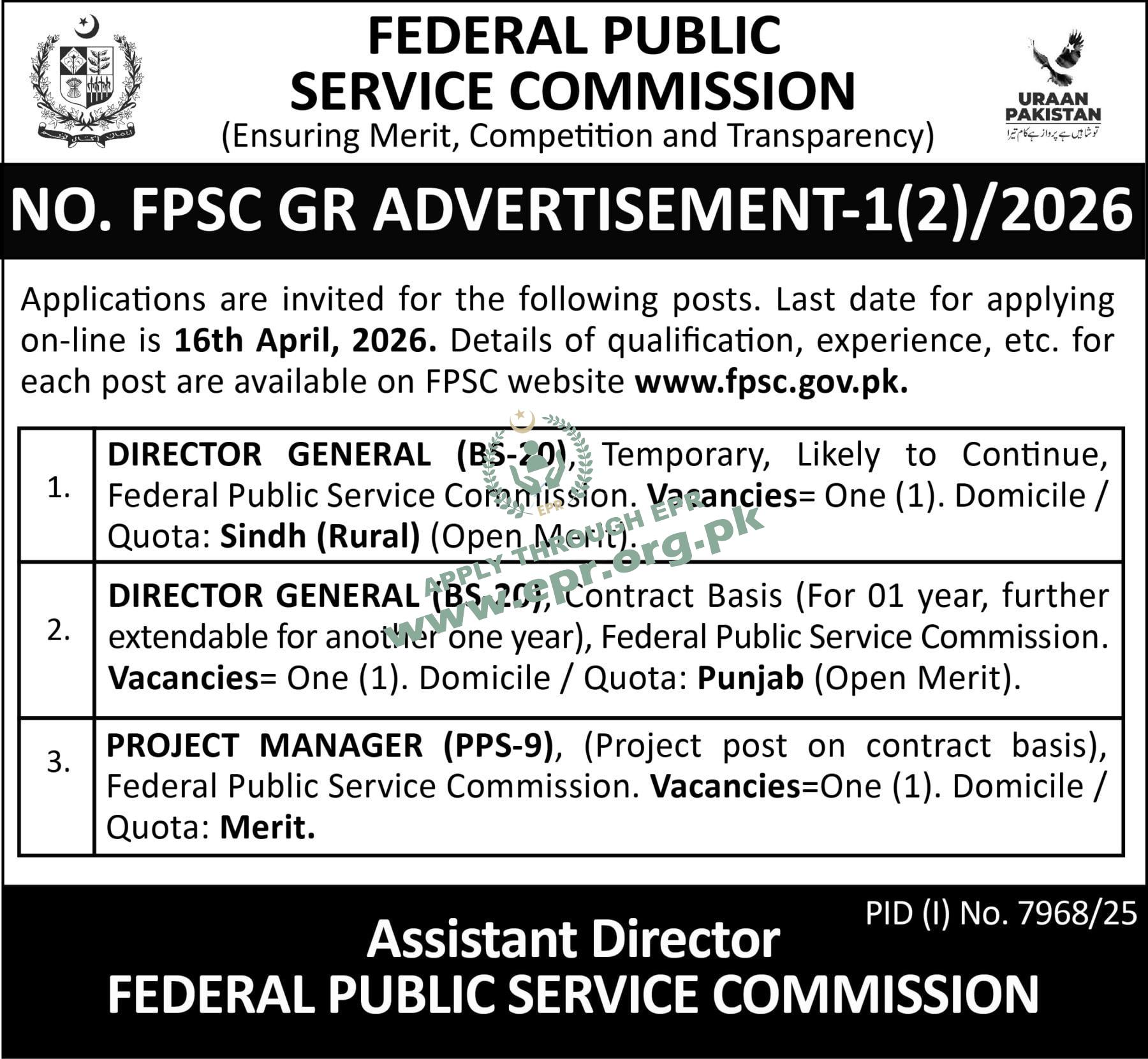 #FPSC #UraanPakistan #FederalPublicServiceCommission #GovernmentJobs2026 #DirectorGeneral #BS20Jobs #ProjectManager #PPS9 #PakistanJobs #MeritBasedRecruitment #FPSCAdvertisement #SindhRuralQuota #PunjabOpenMerit #CivilServicePakistan #Jobs2026 #FederalGovernmentJobs #IslamabadJobs #LeadershipRoles #PublicSectorCareers #ApplyOnline