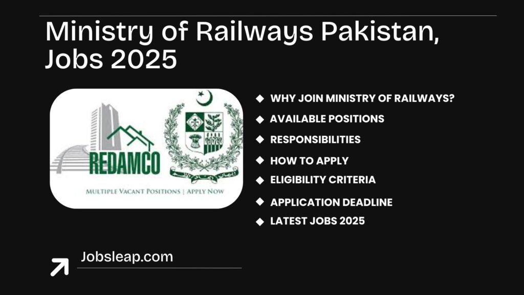 Ministry of Railways Pakistan, Jobs 2025. Join REDAMCO as an Assistant Manager (IT) or GIS Specialist. Submit CV at www.redamco.com by October 10, 2025! Transform Pakistan’s railway estates with innovative real estate development roles!