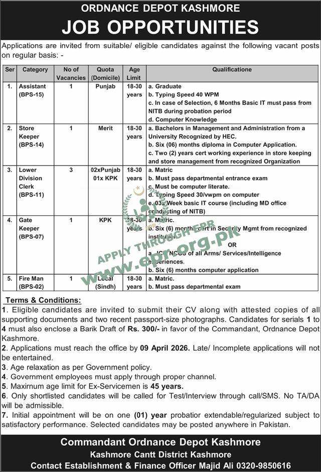 Ordnance Depot, Kashmore, Government Jobs, Sindh Jobs, Assistant, Store Keeper, Lower Division Clerk, LDC, Gate Keeper, BPS-15, BPS-14, BPS-11, BPS-07, Punjab Domicile, KPK Domicile, Merit Quota, Defense Jobs, Military Jobs, Pakistan Army, 2026 Jobs, Regular Positions, Graduate Jobs, Matric Jobs, Typing Test, NITB, Store Management, Clerical Jobs, Kashmore Cantt