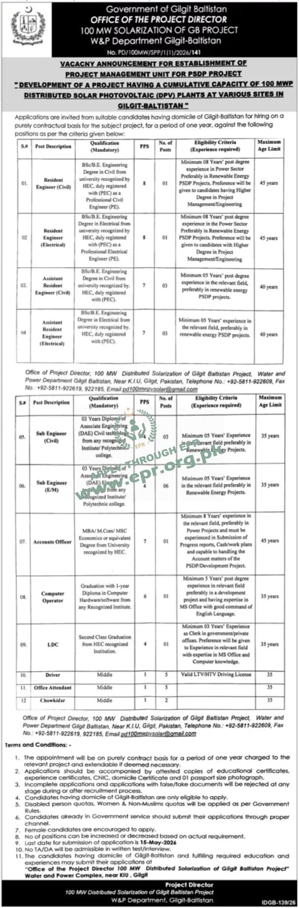 100 MW Solarization Gilgit Baltistan, Water and Power Department GB, Distributed Solar Photovoltaic DPV plants, Resident Engineer Civil, Resident Engineer Electrical, Assistant Resident Engineer Civil, Assistant Resident Engineer Electrical, Sub Engineer Civil DAE, Sub Engineer Electrical, Sub Engineer Mechanical, Accounts Officer, Computer Operator, LDC, Driver, Office Attendant, Chowkidar, PEC registered Professional Engineer, PSDP project, renewable energy, Gilgit-Baltistan domicile, women encouraged, disabled quotas, non-Muslims quotas, KIU Gilgit, May 15 2026 deadline.